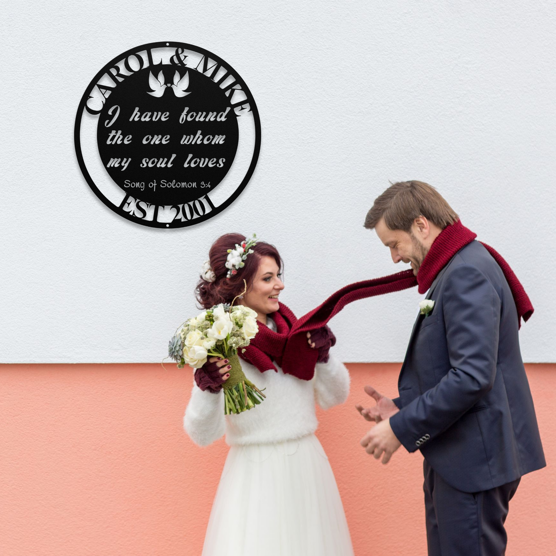 Celebrate your love story with this personalized metal wall art that features the beautiful Song of Solomon verse, "I have found the one whom my soul loves." This elegant design captures the essence of your relationship and is a timeless reminder of your deep connection. Perfect for any couple, this sign adds a heartfelt and personal touch to your home.