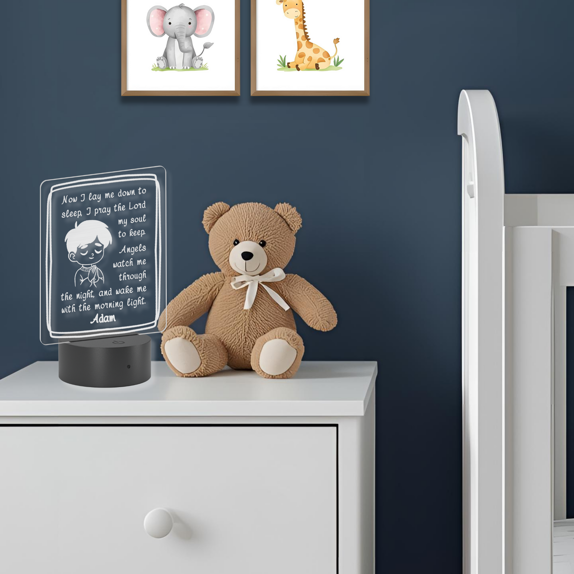 Create a comforting bedtime ritual for your child with our personalized adjustable multicolor LED light, featuring the beloved prayer "Now I Lay Me Down To Sleep." This enchanting light offers a gentle glow with adjustable colors, designed to soothe and provide a sense of security as your child drifts off to dreamland. Perfect for nurturing a peaceful sleep environment, it transforms bedtime into a serene and reassuring experience.